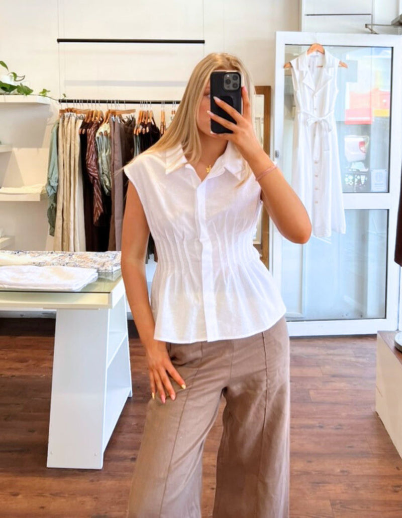 Camille V Neck Broderie Anglaise Sleeve Top in White