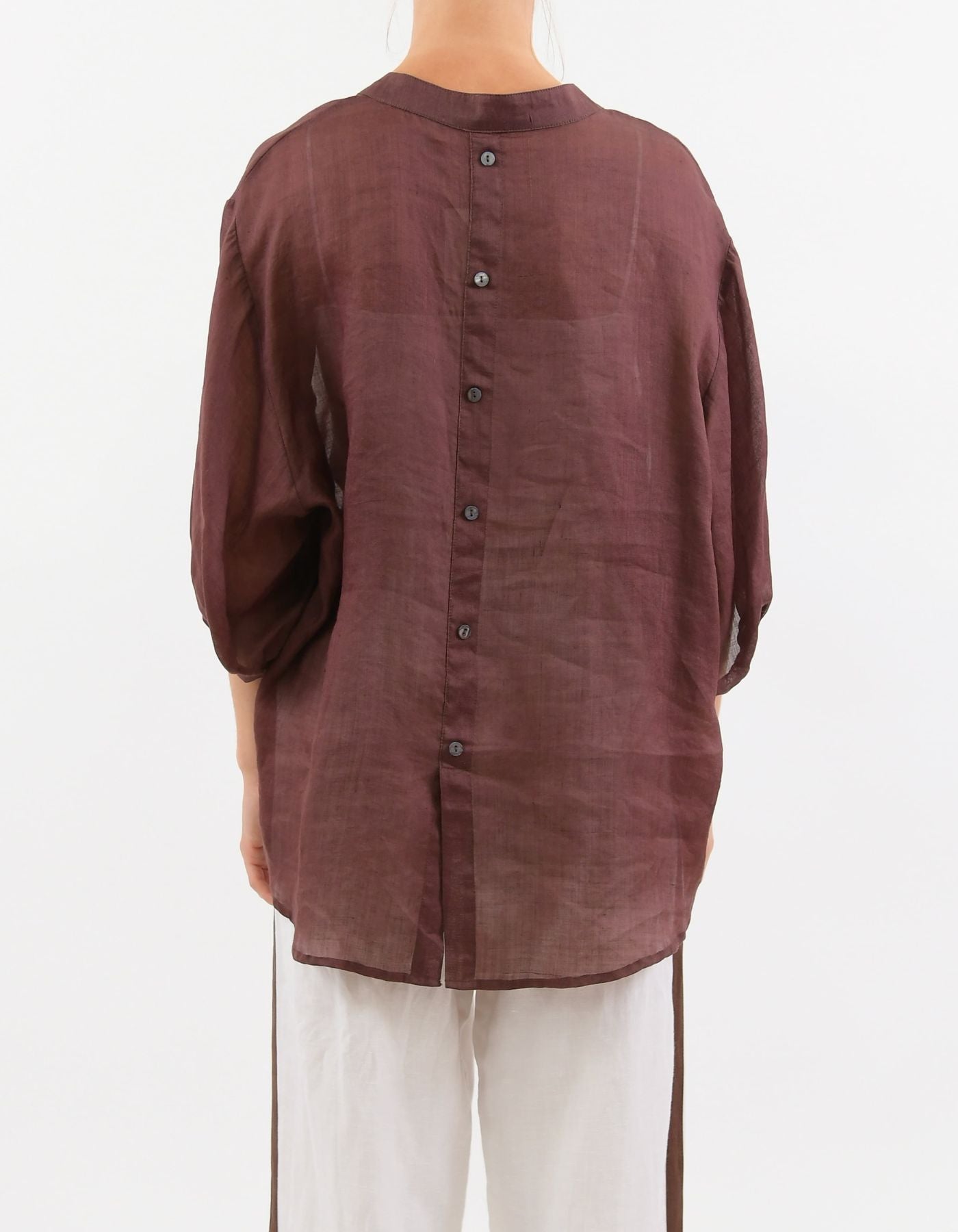 River Button Down Collarless Sheer Linen Shirt in Brown